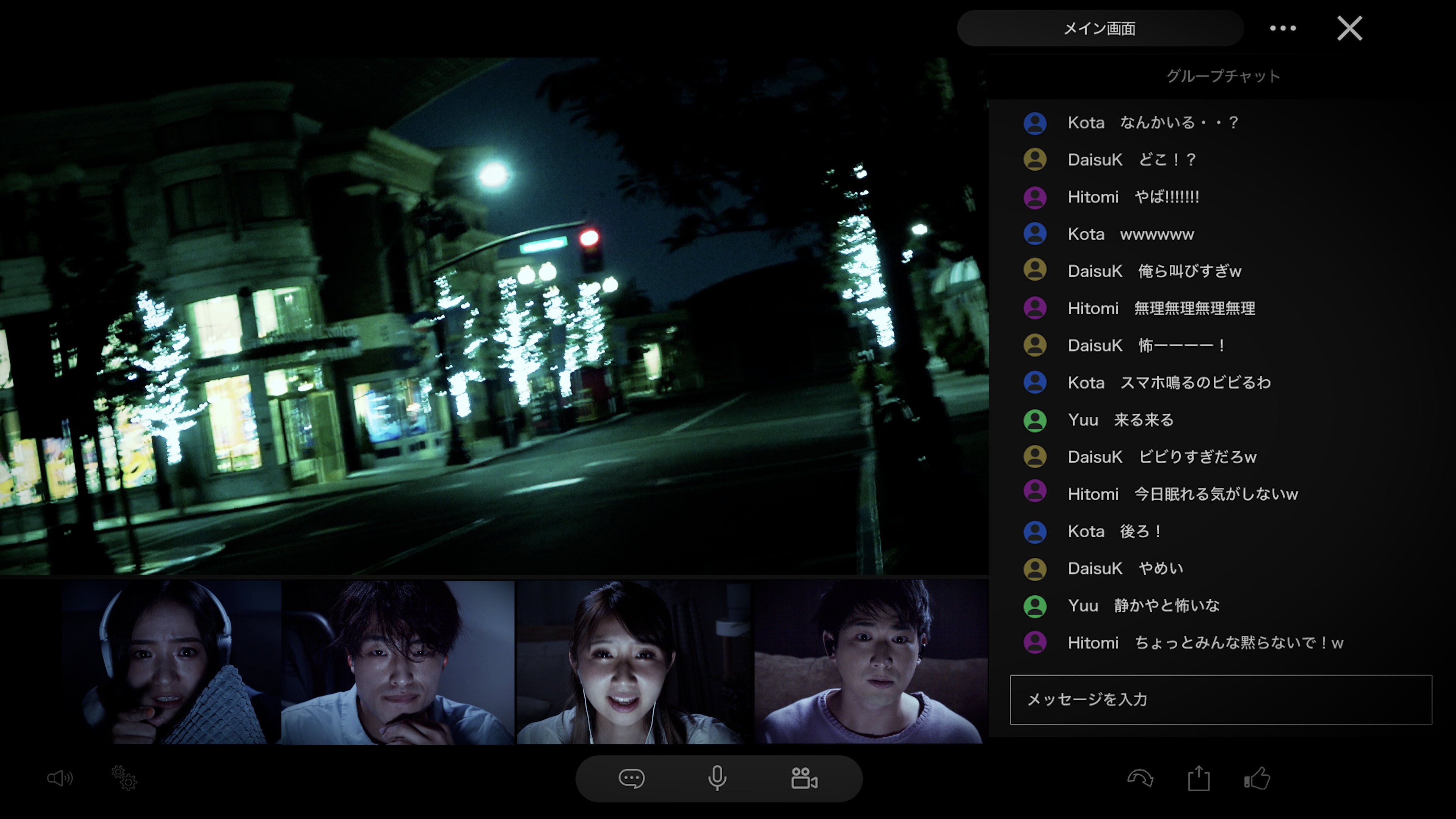 普段は見られない真夜中のパークで行われるツアーをオンラインで見るだけでなく、グループチャット機能やビデオ通話を通して、リアルタイムで、仲間と知恵と力を合わせたり、気持ちやリアクションを共有しながら楽しんだりできるグループ参加型※のオンライン・イベントです。数々のホラーコンテンツをお届けしてきたユニバーサル・スタジオ・ジャパンだからこその予想外の展開や驚愕のホラーギミックを一緒に参加する仲間とともに乗り越えることで、絆深まるホラー体験をお楽しみいただけます。また、コメント機能を使用することで、自分のグループだけでなく他のグループの反応もチェックすることができ、イベント参加者全員とも繋がりながら盛り上がることができます。